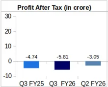 Aksh Optifibre’s Q3 FY26 revenue was down by 15.36% from Q2 FY25 revenue of Rs. 31.19 crore. Further, the company’s loss stood at Rs. 3.05 crore during second quarter of FY25, representing a QoQ increase of 90.49% in loss.