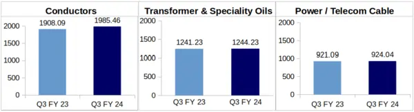 Power / Telecom Cables: Power and Telecom cables contributed Rs. 924.04 crore to the company’s Q3 FY-24 sales against Rs. 921.09 crore to Apar’s Q3 FY-23 revenue. Therefore, revenue from this segment almost remained flat, increasing merely by 0.32% YoY.