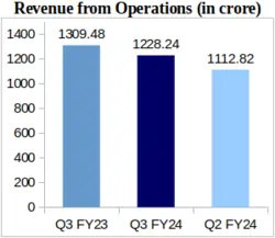 Bajaj Electricals earned a consolidated revenue of Rs. 1,228.24 crore from operations during Q3 of FY-24, representing a decrease of 6.20% on a Year-over-Year (YoY) basis. The company had clocked a revenue of Rs. 1,309.48 crore in Q3 of FY-23.