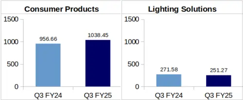 Lighting Solutions: Bajaj’s Lighting Solutions segment quarterly revenue decreased by 7.48% to Rs. 251.27 crore during Q3 of FY-25 from Rs. 271.58 crore in Q3 of FY-24.