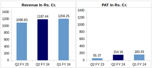 However, there was a remarkable growth in the company’s bottom line, which soared to Rs. 154.18 crore in Q2 of 2023-24 from Rs. 55.37 crore during 2022-23. This reflects a YoY increase in Q2 PAT to 2.78 times its value from FY-23.