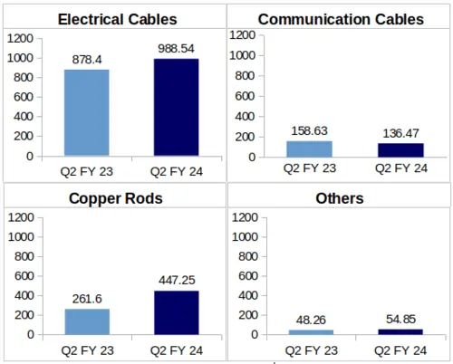 Electric Cables: In Q2 of FY-24, this segment contributed 60.75% to the company’s gross revenue, that is, the sum of segmental revenues without subtracting inter-segmental revenue.