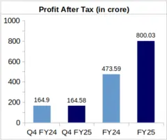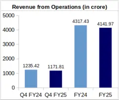 For the entire financial year, the company’s revenue from operations slipped by 4.06% YoY to Rs. 4,141.97 crore in FY25 from Rs. 4,317.43 during FY24. PAT of the company during FY25 jumped to Rs. 800.03 crore which is up by 68.93% from the company’s FY24 profit of Rs. 473.59 crore.