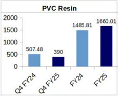 PVC Resin: The company earned Rs. 390 crore as revenue during Q4 of FY25 from its PVC Resin segment against Rs. 507.48 crore clocked during Q4 of FY24. This represents a YoY decrease of 23.15% in the company’s quarterly segmental revenue.