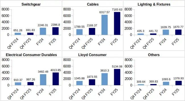 Cables: The company earned Rs. 2,169.37 crore as revenue during Q4 FY-25 from its cable segment against Rs. 1,789.55 crore clocked during Q4 FY-24. This represents an increase of 21.22%% on a YoY basis.