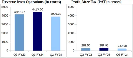On a standalone basis, the company reported a revenue of Rs. 4,400.62 crore from operations, and corresponding Profit After Tax (PAT) of Rs. 287.87 crore for Q3 of FY-24.