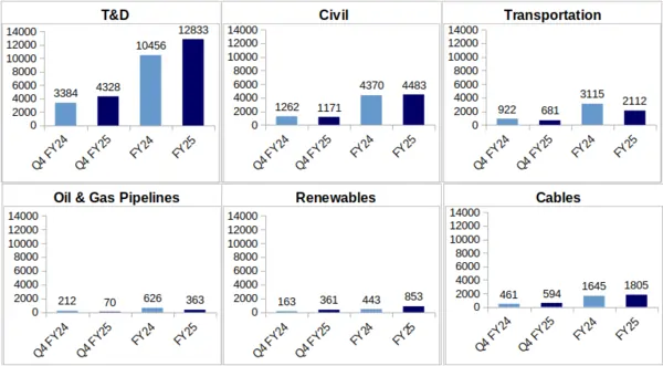 Civil: Civil EPC projects accounted for Rs. 1,171 crore of the company’s gross revenue during Q4 of FY25, and Rs. 4,483 during the entire FY25. While quarterly revenue from this segment shrunk slightly by 7% from Rs. 1,262 crore logged for Q4 of FY24, KEC’s annual civil segment revenue grew by 3% from Rs. 4,370 crore reported for FY24.