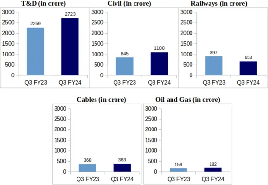 Transmission & Distribution (T&D): T&D segment of the company contributed a major chunk to the company’s revenue during Q3 of FY-24. The company earned a revenue of Rs. 2,723 crore from its T&D business during Q3 of FY-24 against Rs. 2,259 crore recorded for Q3 of FY-23. This represents an increase of 20.54% on a YoY basis.