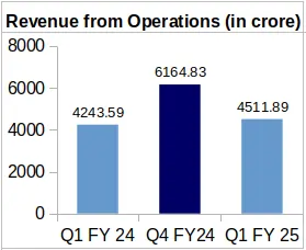 However, the top line saw a significant Quarter-on-Quarter (QoQ) dip of 26.78% in Q1 FY- 25 from its Q4 FY-24 revenue, which stood at Rs. 6,164.83 crore.