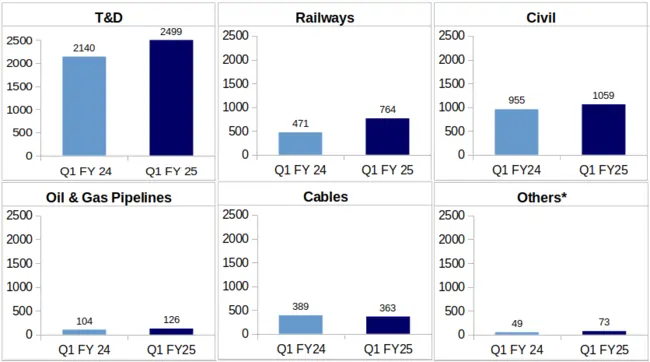 Others: KEC’s ‘Others’ segment’s revenue which consists of the company’s ‘solar/cabling’ business, demonstrated an increase by 50% to Rs. 73 crore in Q1 FY-25 from Rs. 49 crore in Q1 FY-24.
