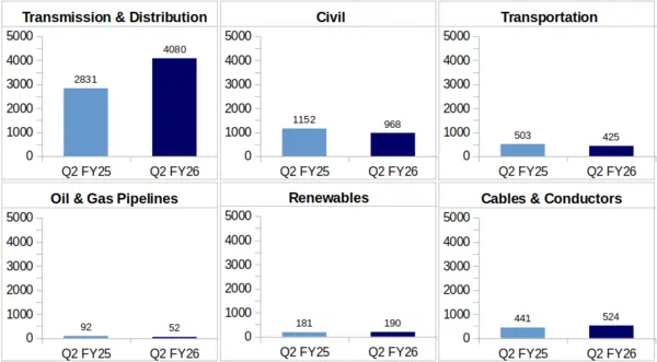 Transmission & Distribution: During Q2 of FY26, the company reported Rs. 4,080 crore as revenue from its Transmission & Distribution segment against Rs. 2,831 crore earned during Q2 of FY25. This shows a jump by 44% YoY.
