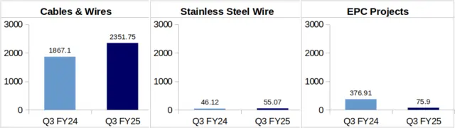 EPC Projects: KEI Industries reported a revenue of Rs. 75.90 crore from this segment in third quarter of FY-25. This reflects a YoY decrease of 79.86% from Rs. 376.91 crore, earned by the company from its EPC Projects business during Q3 of FY-24.