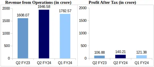 KEI Industries generated Rs. 1,946.58 crore revenue from operations during Q2 of FY-24. This shows 21.05% Year-over-Year (YoY) increase in revenue from Rs. 1,608.07 crore recorded during Q2 of FY-23.