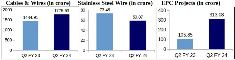 Stainless Steel Wire: The company logged a revenue of Rs. 59.07 crore in Q2 of FY-24 from its Stainless Steel Wire segment. This reflects a YoY decrease of 19.61% from Rs. 73.48 crore during Q2 of FY-23.
