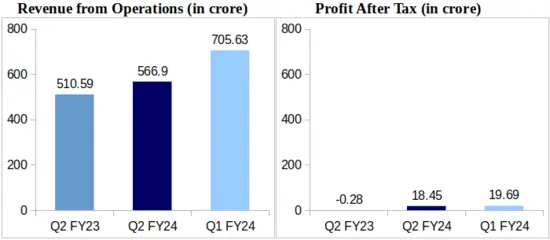 Orient Electric reported a revenue of Rs. 566.90 crore from operations during Q2 of FY-24 against Rs. 510.59 crore clocked during Q2 of FY-23. This represents a YoY growth of 11.03% in revenue of the company.