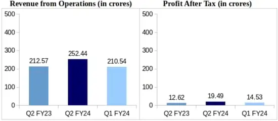 Consolidated PAT of the company increased by 54.44% YoY to Rs. 19.49 crore in Q2 of FY-24 from Rs. 12.62 crore during Q2 of FY-23.
