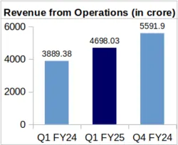 Polycab’s Q1 FY-25 revenue from operations stood at Rs. 4,698.03 crore, marking an YoY increase of 20.79% from Rs. 3,889.38 crore, earned during initial quarter of FY-24.