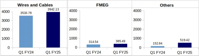 Wires and Cables: This segment of the company bought in a revenue of Rs. 3,942.13 crore during Q1 of FY-25 against Rs. 3,533.78 crore during Q1 of FY-24. This increase in revenue showed a growth of 11.56% YoY.