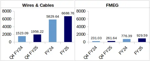 Wires & Cables: During Q4 of FY-25, this segment of the company brought in a revenue of Rs. 1,956.22 crore as compared to Rs. 1,523.09 crore during Q4 of FY-24. This shows a YoY increase of 28.44%.