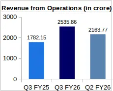 RR Kabel has gathered a consolidated revenue of Rs. 2,535.86 crore in Q3 FY26, representing a 42.29% Year-over-Year (YoY) increase compared to the company’s revenue of Rs. 1,782.15 crore in Q3 FY25. Further, the company’s PAT has soared to Rs. 118.25 crore in Q3 FY26 from Rs. 68.57 crore in Q3 FY25, a 72.45% YoY increase.
