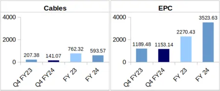 Cables: Vindhya Telelinks’ Cables segment revenue was Rs. 141.07 crore during Q4 of FY-24 as compared to Rs. 207.38 crore during Q4 of FY-23, reflecting a decrease of 31.98% YoY.