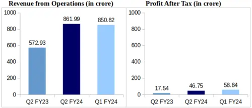 Vindhya Telelinks reported Rs. 861.99 crore as its consolidated revenue from operations for Q2 of FY-24. This shows a remarkable 50.45% Year-over-Year (YoY) increase from Rs. 572.93 crore recorded Q2 of FY-23.