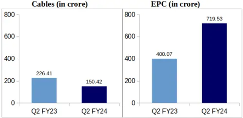 Cables: Vindhya Telelinks reported Rs. 150.42 crore as revenue from Cables segment during Q2 FY-24 against Rs. 226.41 crore during Q2 of FY-24. This represents a YoY 33.56% decrease from Q2 FY-23 to Q2 FY-24.